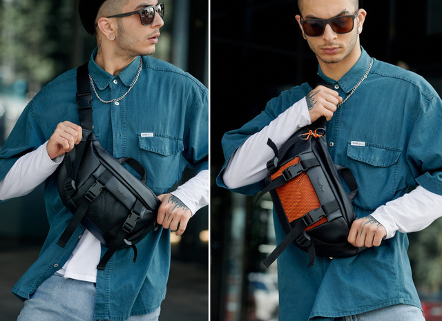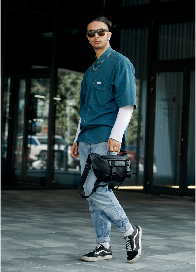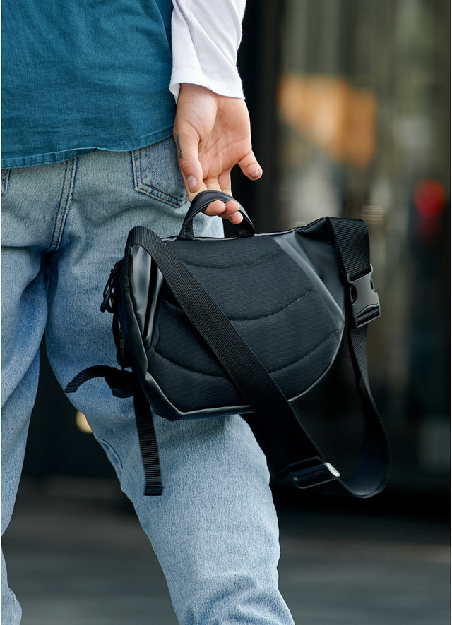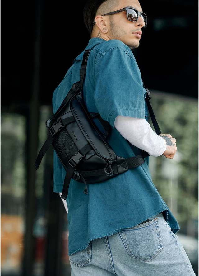 Містка чоловіча сумка чорна, велика бананка через плече, на пояс | модна наплічна, поясна з екошкіри
