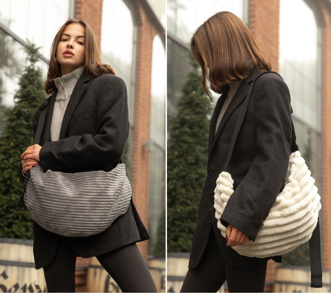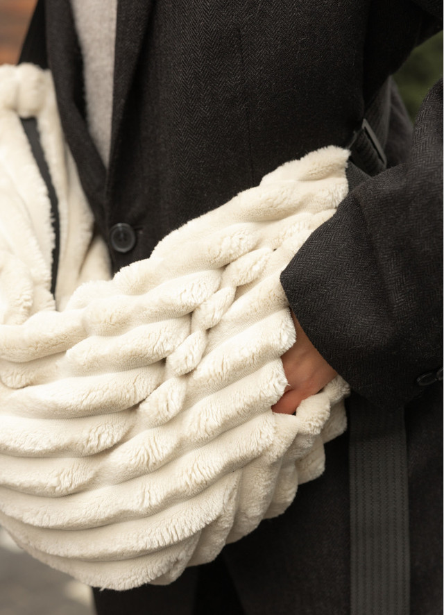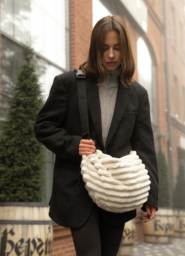 Хутряна жіноча сумка муфта напівкругла, кросбоді з хутром та довгим ремінцем через плече, зимова, демісезон сіра / молочна