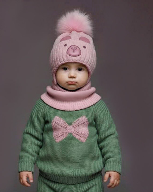 Новинка! Гарний дитячий зимовий набір ніжно-пудрового кольору для маленької модниці: тепла шапочка із зручною зав'язкою на м'якій бавовняній підкладці та пухнастим помпоном + в'язаний хомут